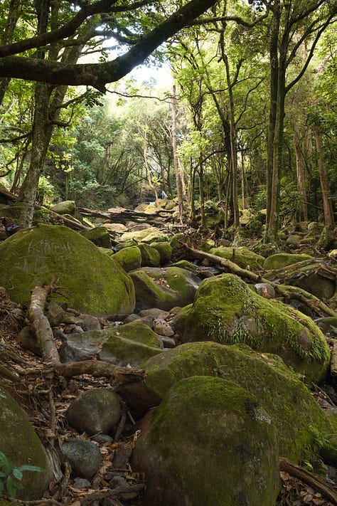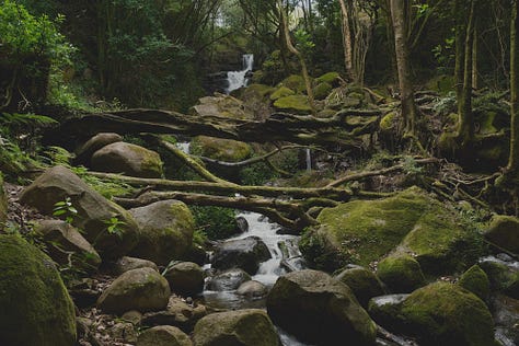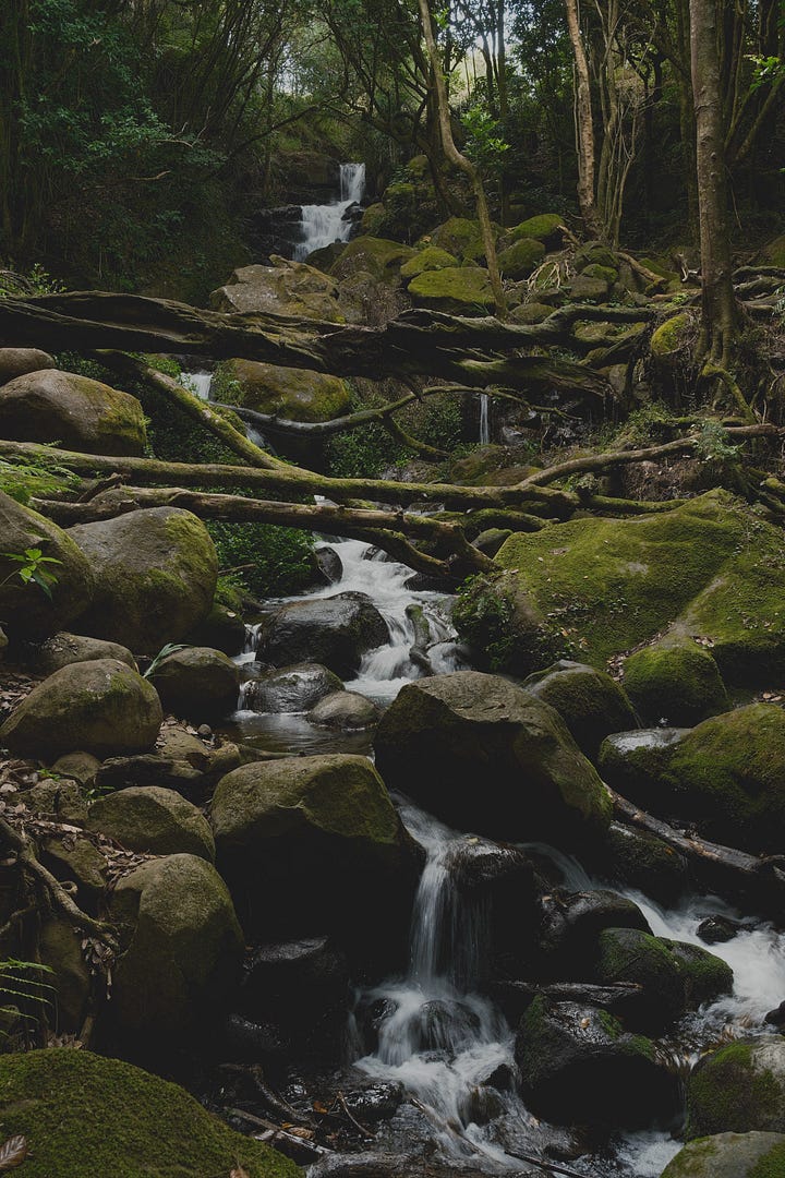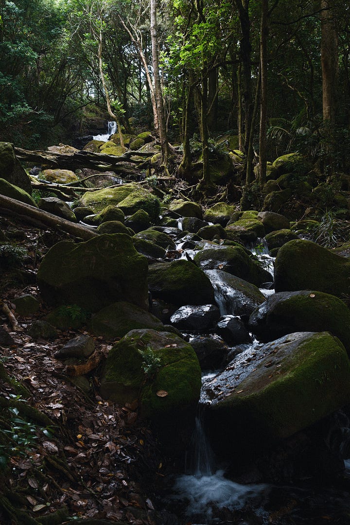 The path to the waterfall did not start where the signpost was installed. It just a few meters down along the road that ran above the stream. The nondescript entry point gave no indication that the path down to the waterfall would be a beautiful tree covered short walk to an active waterfall. Water cascaded down from the roadside and feed a moss covered rock strewn river bed. The lush tree cover created an atmospheric scene that made the place look like a scene out of posh magazine.